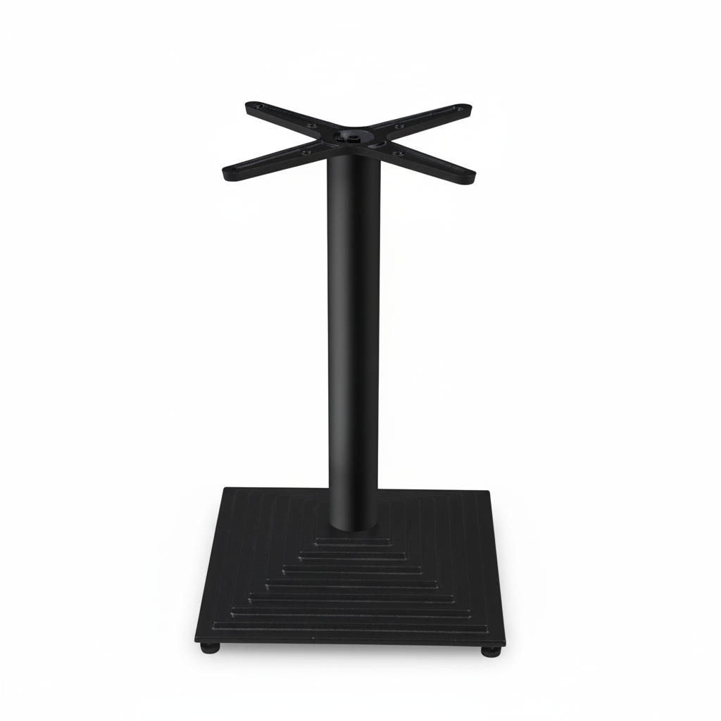 The Meridian is distinguished by its architectural tiered footprint, featuring a heavy-duty square base with a sophisticated pyramid-step design. Finished in a resilient, high-density matte black powder coating, this table base provides a powerful visual anchor while ensuring a secure, wobble-free surface for your patrons.